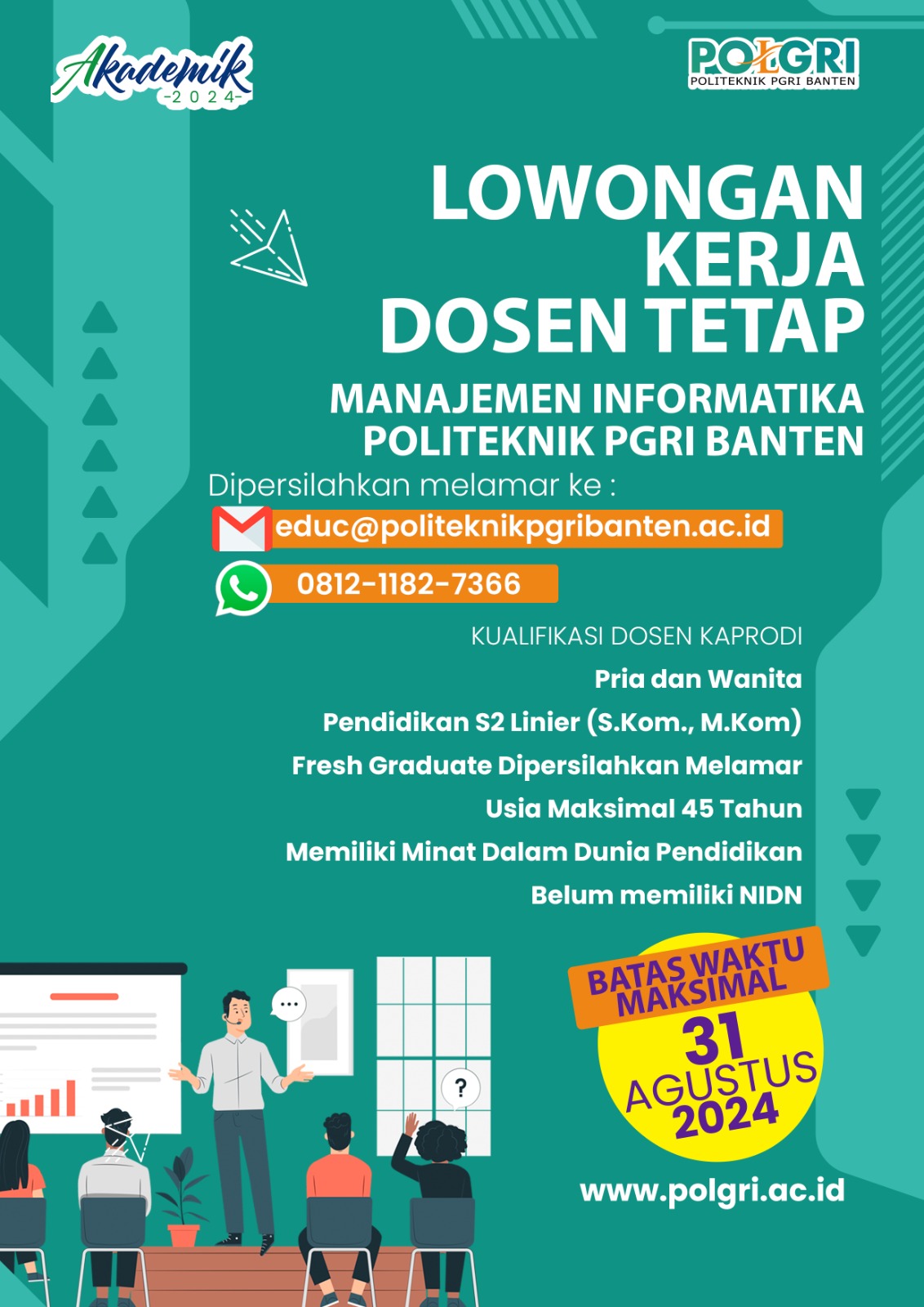 Jika anda berminat dengan lowongan kerja dosen kirim email ke : educ@politeknikpgribanten.ac.id atau hubungi Janti dan Feby. WA 0812-1182-7366