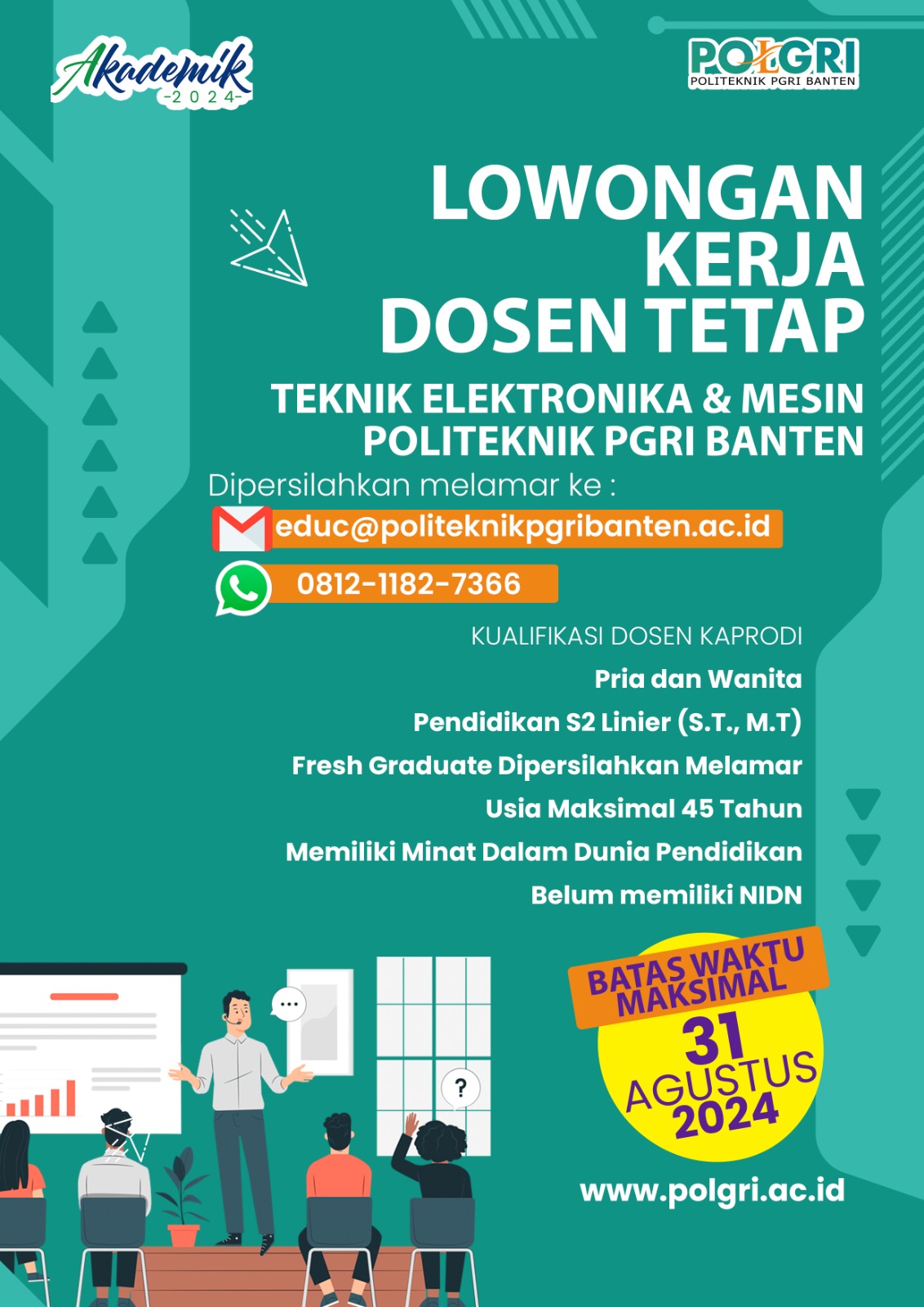 Politeknik PGRI Banten merupakan perguruan tinggi Vokasi di Banten, Indonesia, yang berdiri pada tahun 2003. POLGRI (Politeknik PGRI Banten) Memiliki Jargon “Kuliah Dicarikan Kerja”. Saat ini Politeknik PGRI Banten sedang membuka lowongan kerja dosen teknik mesin dan Teknik Elektronika dengan formasi 5 orang dosen. Adapun kualifikasinya sebagai berikut: